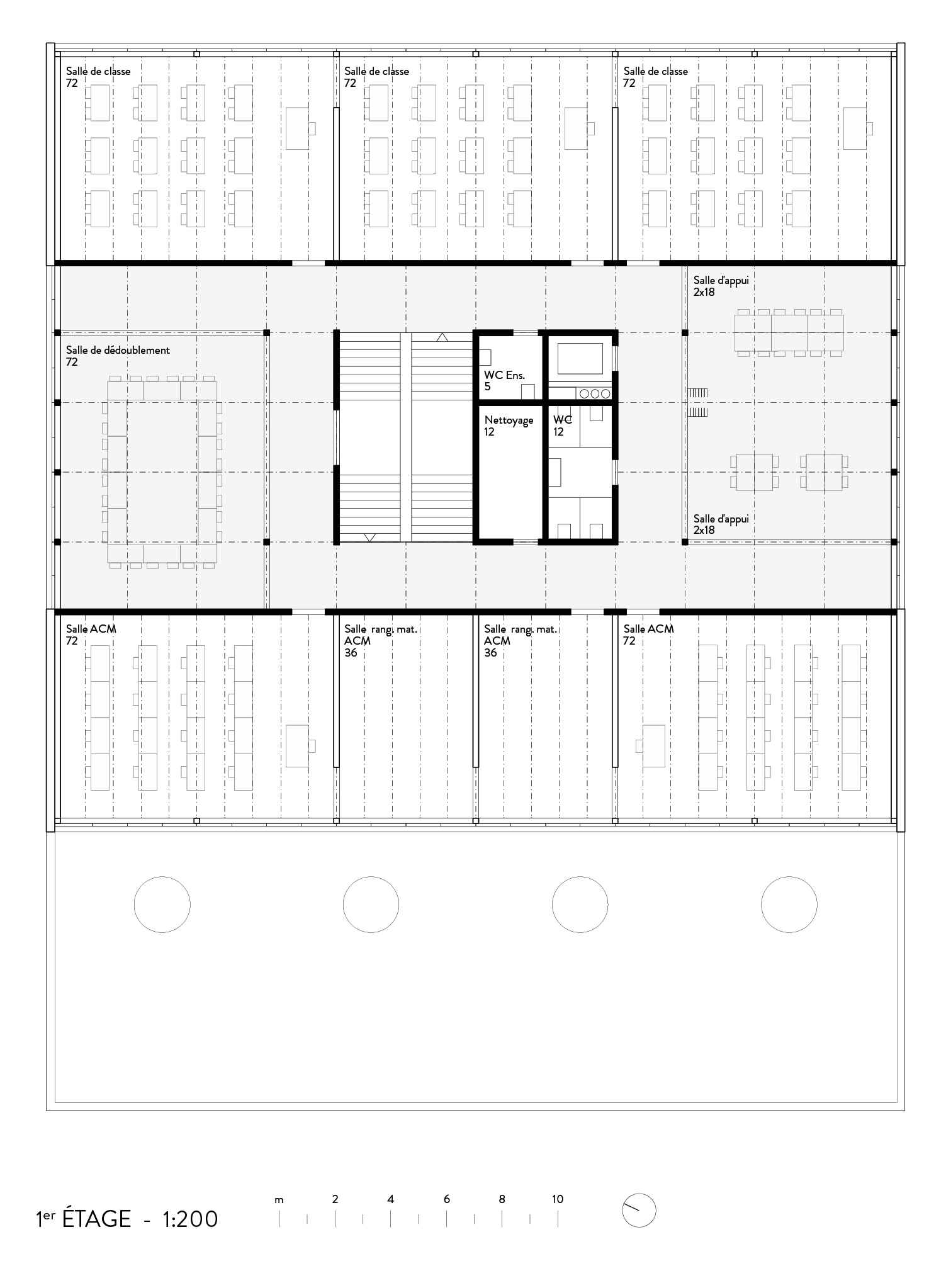 Aux 3 étages supérieurs, l’entier des classes du programme scolaire attendu prend place dans une organisation compacte valorisant une circulation verticale lumineuse et généreuse faisant entrer la lumière au cœur des étages des classes par un important lanterneau en toiture.