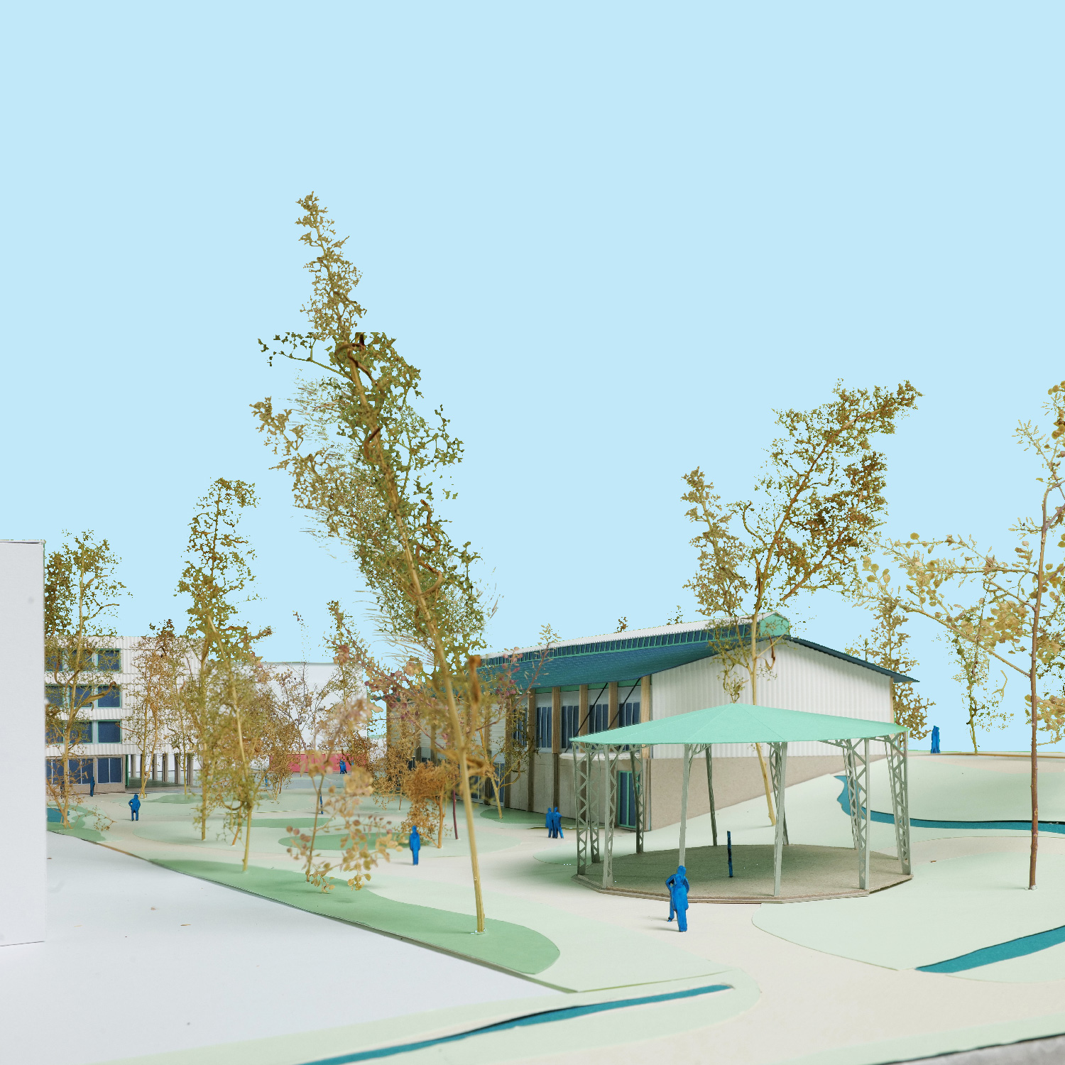Cette implantation est complétée au Sud par un kiosque animant la programmation publique du parc paysager valorisant la présence de la meunière.