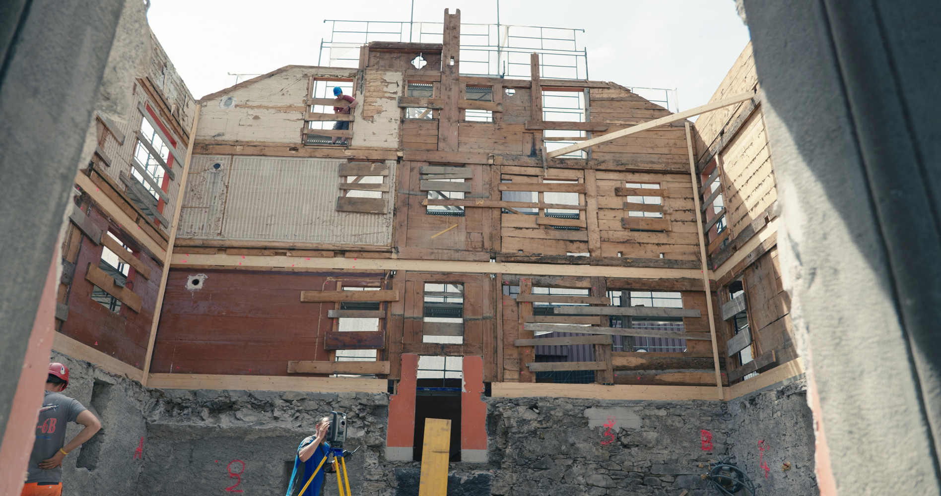 L’édifice, à l’abandon, est dans un état avancé de délabrement. Seuls les façades et les éléments présentant un intérêt patrimonial sont conservés. À chaque niveau le bâtiment est surélevé pour offrir la hauteur d’étage nécessaire à sa nouvelle fonction. Cette « élévation » par empilement s’effectue par un procédé aussi prodigieux qu’archaïque, un homme et un cric. Prouesse rappelant que l’action humaine, aussi modeste soit elle, peut parfois déplacer des montagnes (ou un bâtiment).